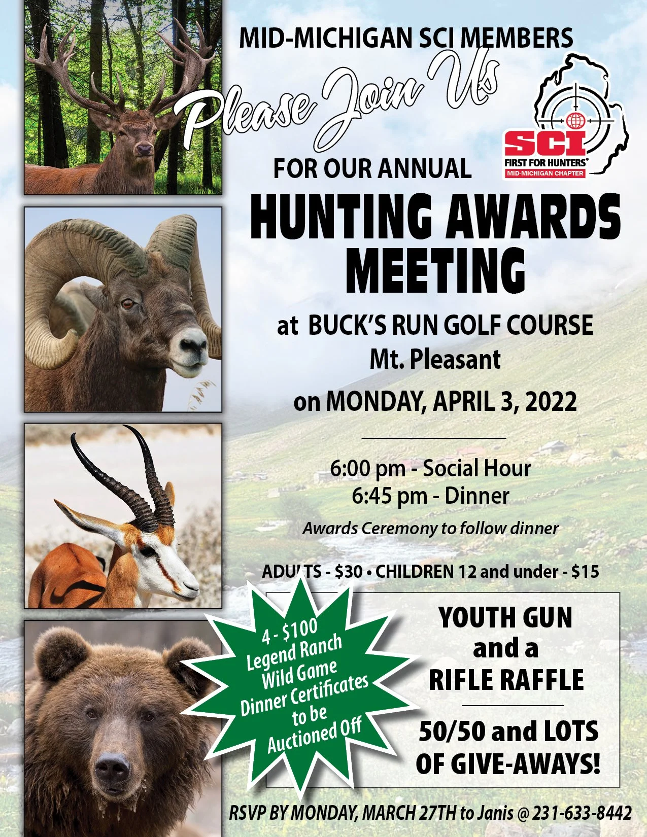 Please Join us FOR OUR ANNUAL FIRST FOR HUNTERS' HUNTING AWARDS MEETING at BUCK'S RUN GOLF COURSE Mt. Pleasant on MONDAY, APRIL 3, 2022 6:00 pm - Social Hour 6:45 pm - Dinner